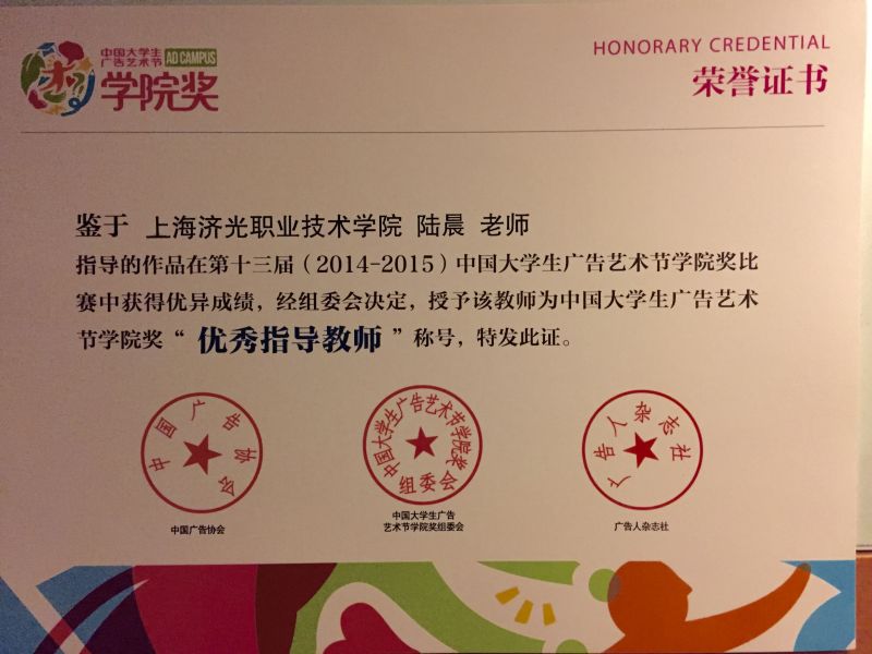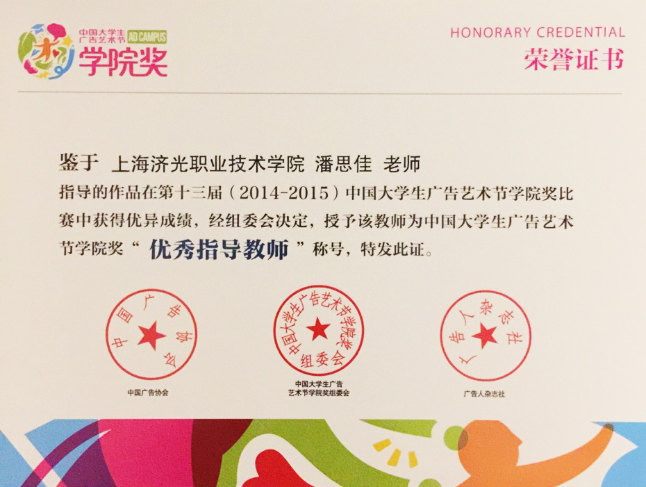2015年4月,我院建筑系广告设计与制作专业由潘思佳、陆晨等骨干教师组织13级广告专业学生参加了第十三届中国大学生广告艺术节学院奖·春季赛之商业选题RIO锐澳鸡尾酒包装设计大赛,通过班里选拔、教师辅导,共选送15份学生包装设计作品,其中9份作品获奖,杨晓玲等3位同学获得佳作奖,杨艳艳等6位同学获得优秀奖,潘思佳老师、陆晨老师分别获得中国大学生广告艺术节学院奖“优秀指导教师”称号。