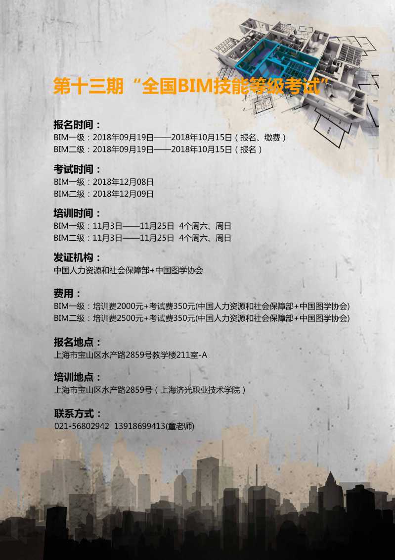 第十三期“全国BIM技能等级考试”建筑类一级、二级报名培训点:上海济光职业技术学院。