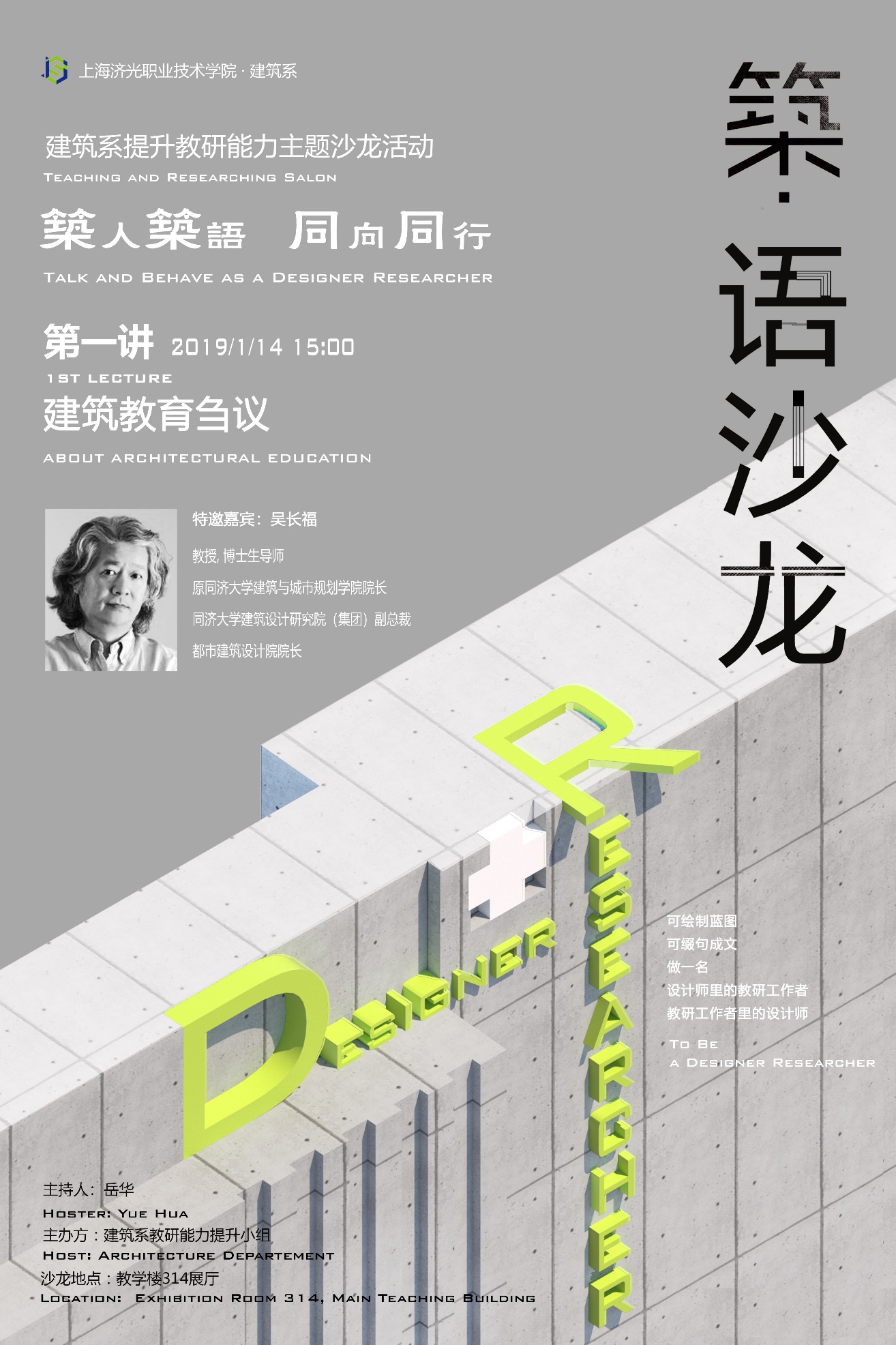 “筑人筑语,同向同行”。为提升建筑系教职人员教研能力,搭建教研大平台,建筑系特主办“筑语沙龙”系列活动,通过多元化形式与建筑行业教育教学专家共同探讨教研能力提升的途径及方法。2019年1月14日下午,“筑语沙龙”第一次活动顺利开展。我院党委书记姜富明教授到场指导,他认为“筑语沙龙”活动体现了学院“以专业建设为立校之本,以质量提升为强校之路”的发展思路,并对建筑系全体教职人员提出了不断提升教研能力的要求。