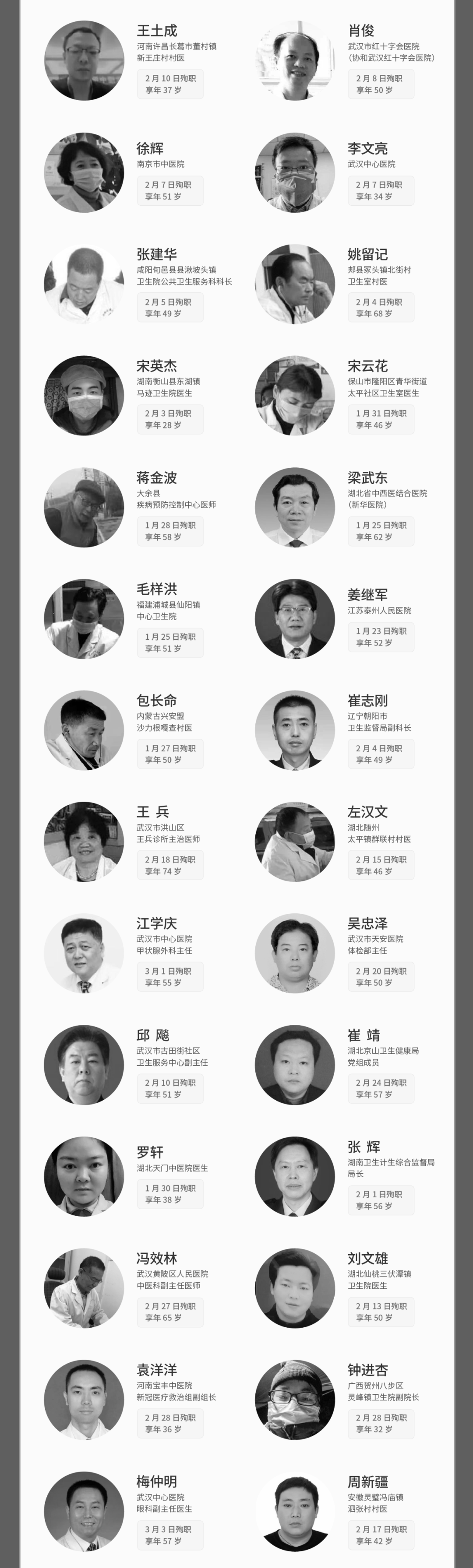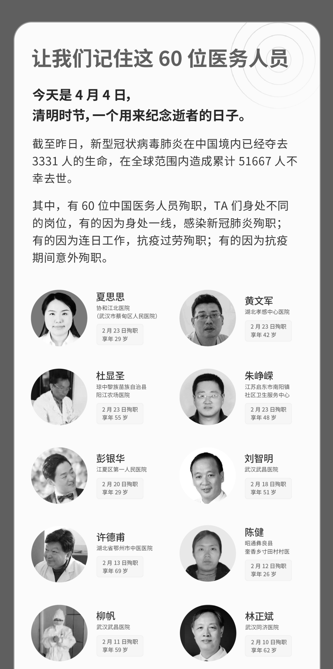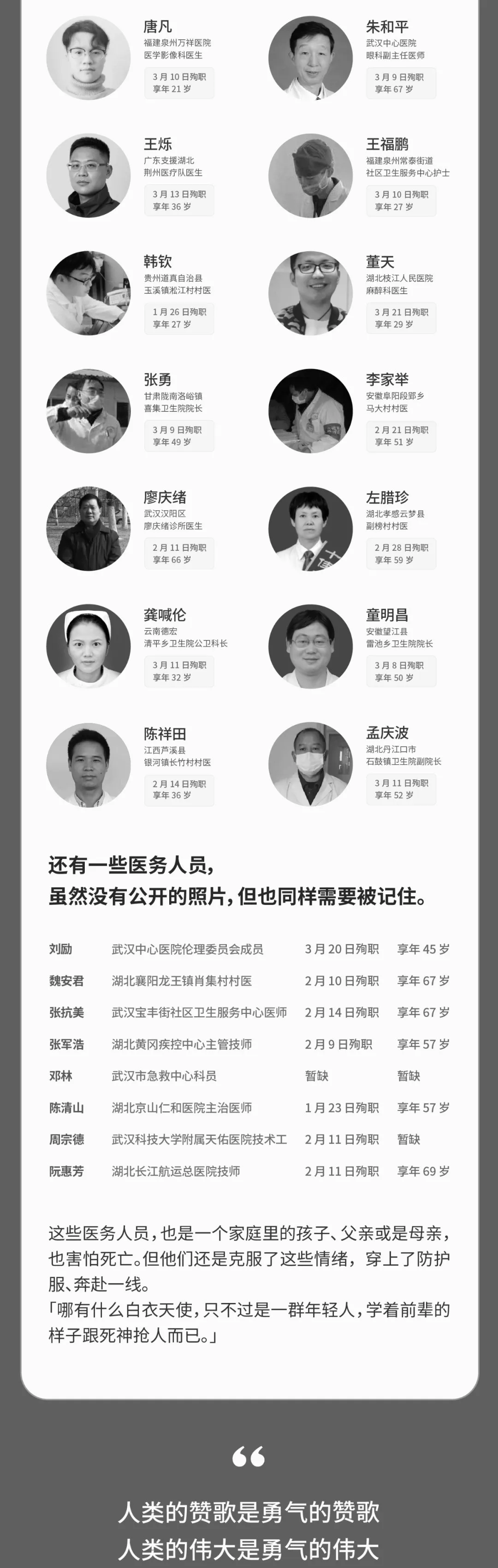有句话说,“哪有什么岁月静好,不过是有人在替我们负重前行” 这个清明,缅怀勇士;这个清明,致敬英雄。我们应当永远铭记这些抗疫英雄的名字: