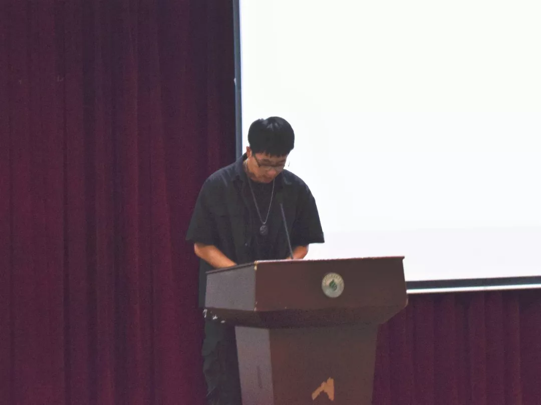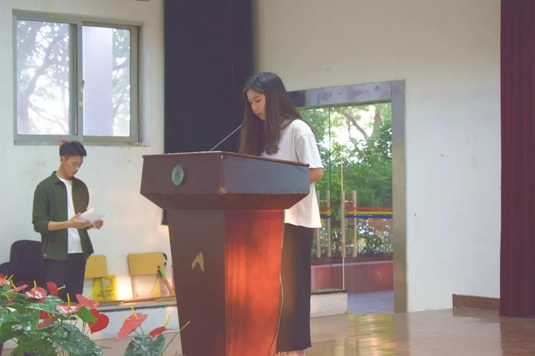 继而,我系学生会主席黄沈乐上台发言。她分享了自己在学生会这一年的收获,也感谢老师的栽培与信任。她提到:要在以学习为第一的前提下,认真担负起部门任务,不拖沓不抱怨。以服务同学为出发点,对工作要时刻保持饱满的热情。
