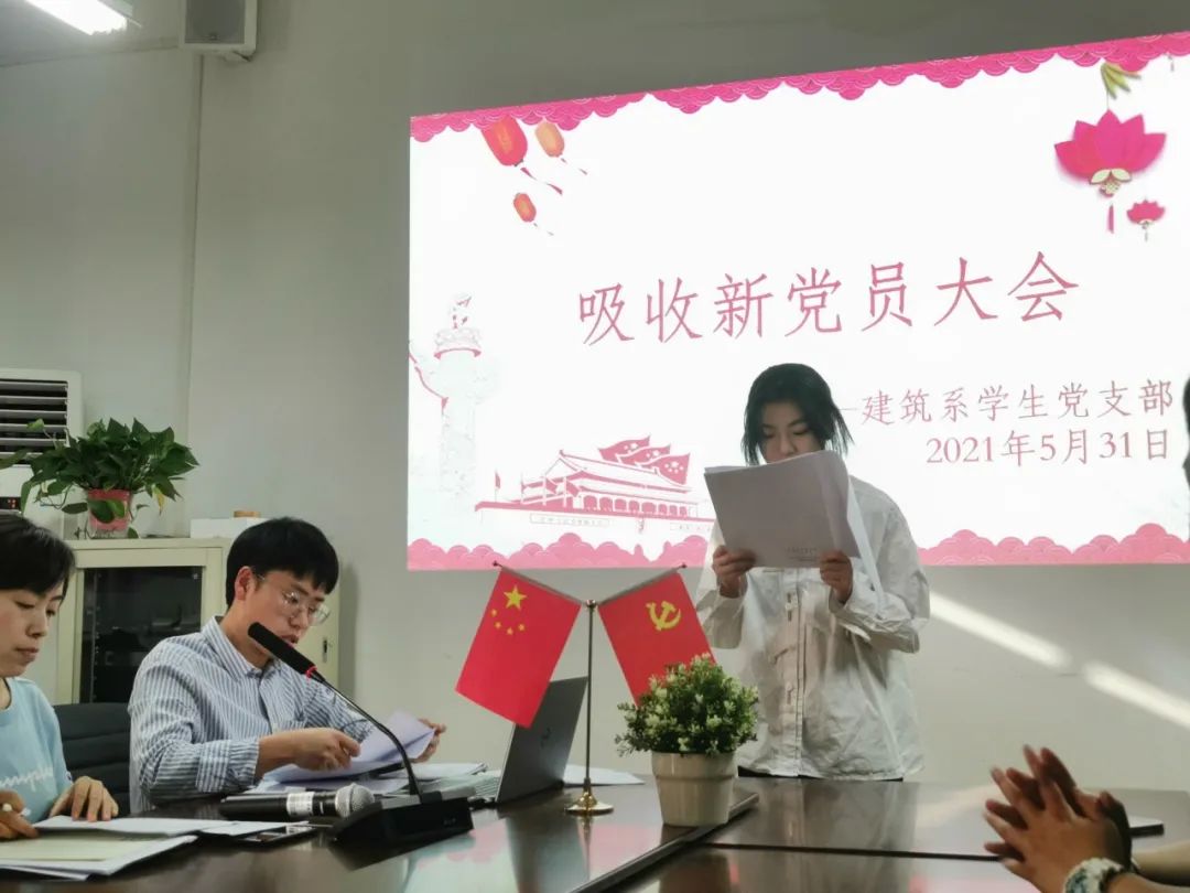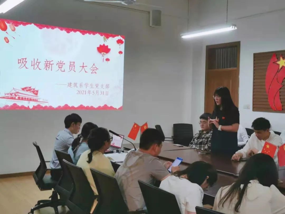 5月31日,建筑系学生党支部在学生活动中心党建活动室,组织开展接收新党员支部大会,会议由支部书记张雪莹同志主持,支部全体正式党员、预备党员及发展对象参与此次议会。