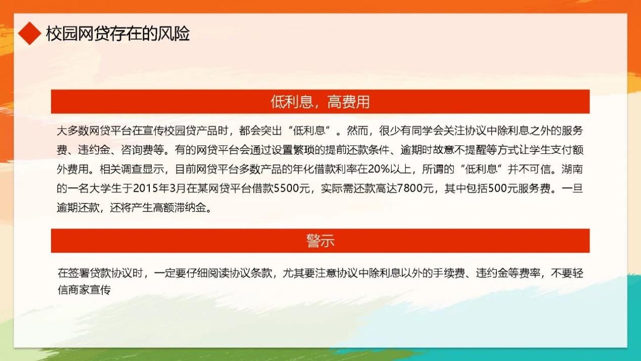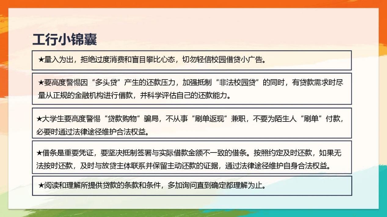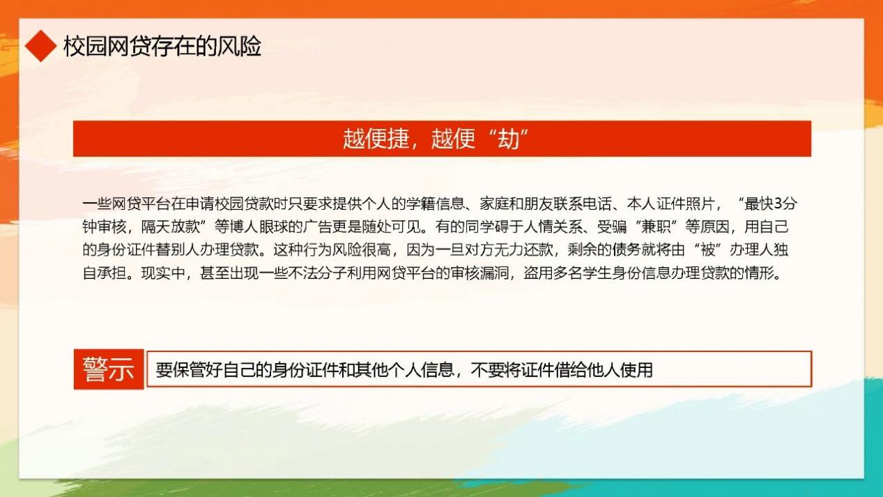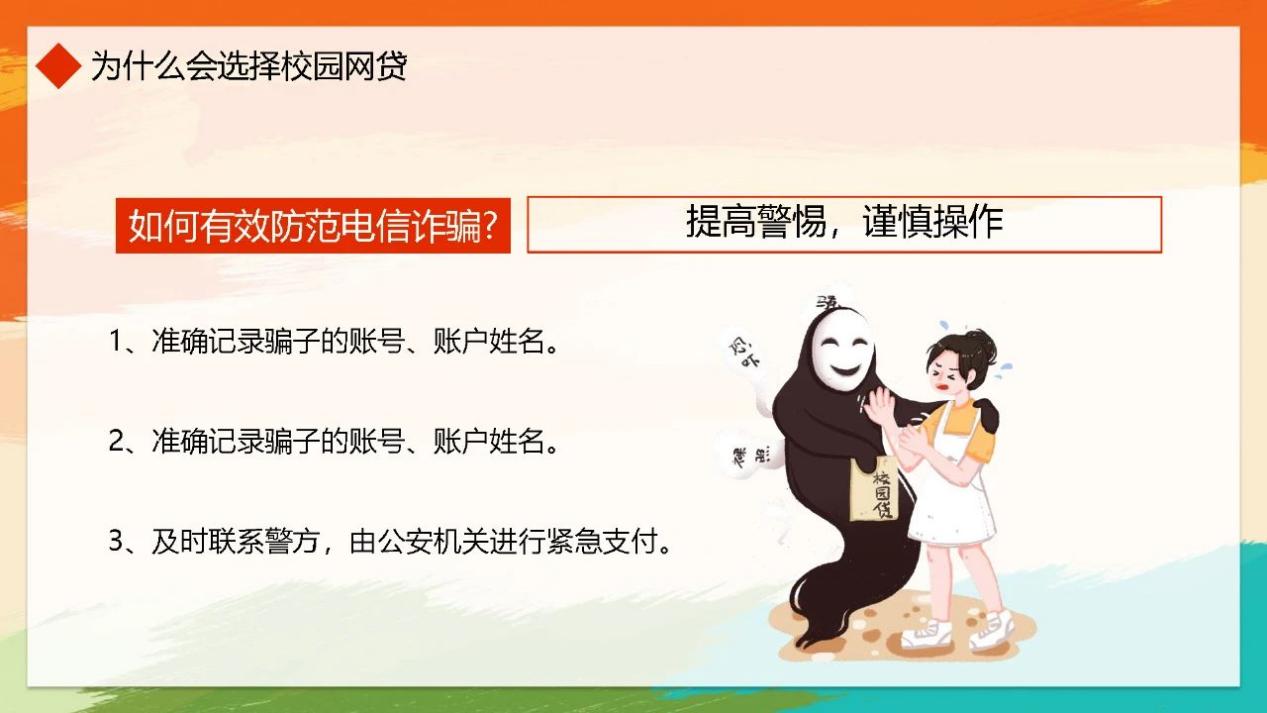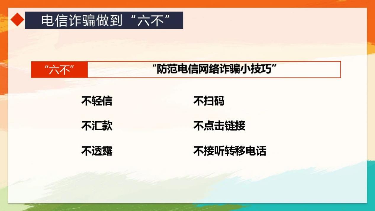 请大家谨记,为了自己的信息安全,严谨借出银行卡。银行卡不要与身份证放在一起,防止他人冒充挂失。个人信用制度非常重要。若有不良信用记录则会影响到个人出行、就业和家庭等。在校园中一定不要接触校园贷,利滚利滚雪球式的增长让人措手不及。不要随意盲目借贷,要培养自己的理财与甄别和防范能力。防范电信诈骗做到六不要:不轻信、不汇款、不透露、不扫码、不点击链接、不接听转接电话。