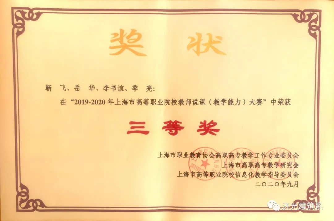 我系靳飞、岳华、李书谊、季亮老师在“2019-2020年上海市高等职业院校教师说课(教学能力)大赛”中荣获三等奖