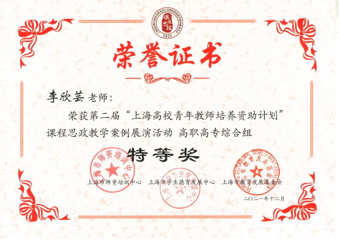 我系李欣芸老师荣获第二届“上海高校青年教师培养资助计划”课程思政教学案例展演活动高职高专组特等奖