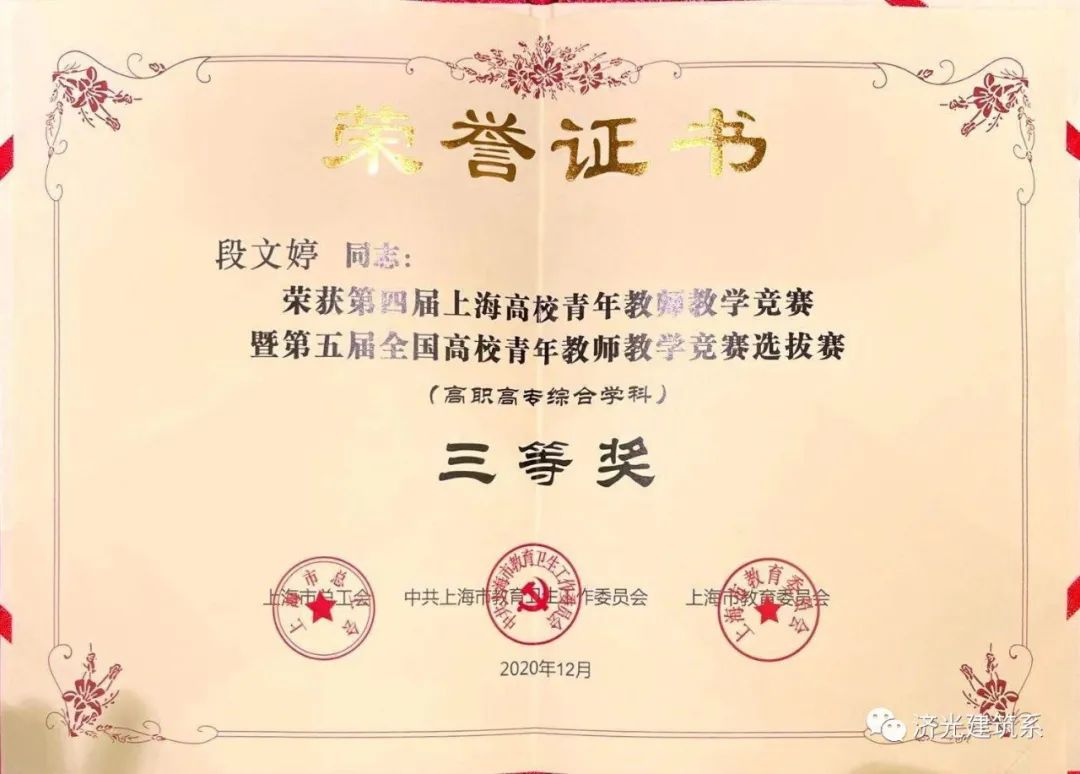 我系段文婷老师在第四届上海高校青年教师教学竞赛暨第五届全国高校青年教师教学竞赛选拔赛荣获三等奖