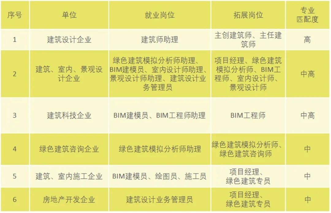 毕业生能在建筑设计、室内设计、规划设计、景观设计、绿色建筑咨询、BIM咨询、建筑施工、房地产开发等领域从事相关工作。