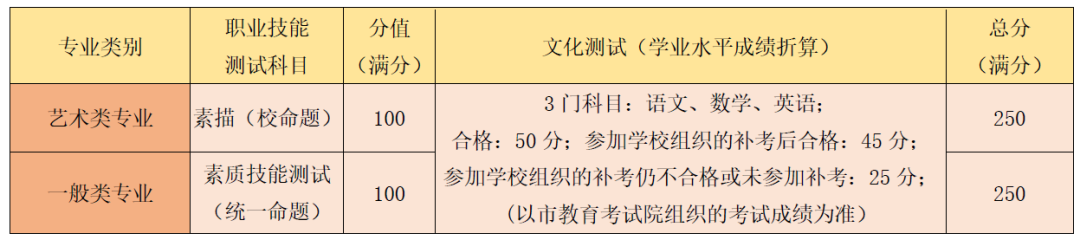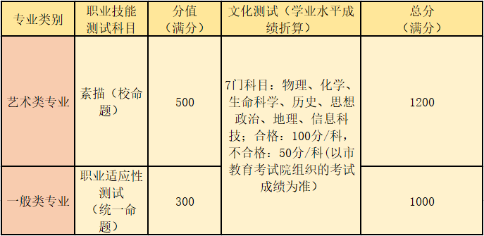 ●录取原则:作为录取依据的总分由文化测试成绩和职业技能测试成绩直接合成。按分数优先原则,以合成总分从高到低择优录取,如遇总分相同则依次比较素质技能测试中的时事政治、法律道德、团队合作、生涯规划的成绩,并参考学业水平等级性考试成绩、综合素质评价信息。