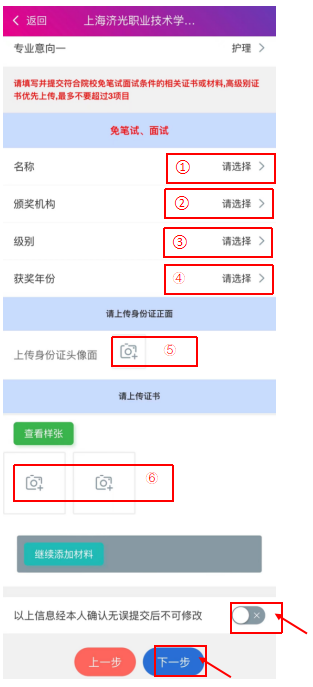 7.完成以上步骤后如需申请“免笔试、面试”资格的考生请点击“申请免笔试、面试资格”;考生按如下要求填写及上传符合“免笔试、面试”条件的相关材料,点击提交并耐心等待审核结果。①点击“名称”下拉菜单,选择符合要求的证书类型。②点击“级别”下拉菜单,选择与证书对应的级别。③点击“颁证机构”下拉菜单,选择与证书匹配的颁证机构。④点击“获奖年份”下拉菜单,选择获得证书、奖项的相应年份。⑤点击“添加照片”图标,每位考生均需上传提交身份证带照片面。⑥点击“添加照片”按钮,根据提示上传证书的照片,图片质量务必要清晰。(如下图所示)