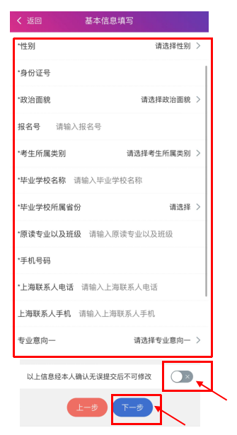 6.请按要求填写基本信息(带*号的信息为必填项,不带*号的为选填项),填写完毕请按下图操作,确认无误则点击“下一步”提交预报名信息及再次查看确认基本信息。