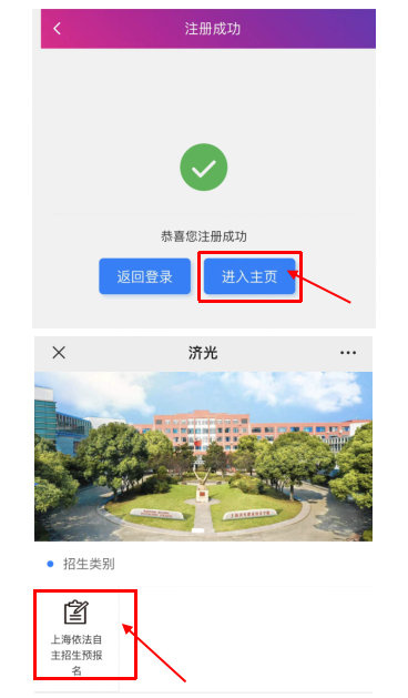 4.注册成功,点击“进入主页”——>“上海依法自主招生预报名”。