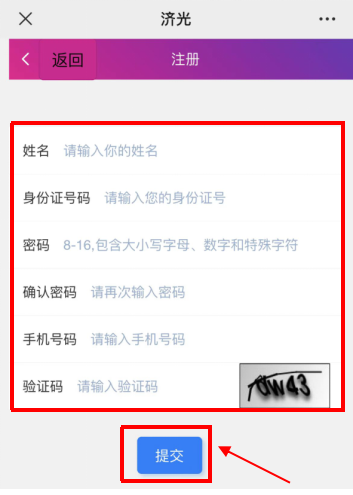 2.初次打开预报名系统请点击“注册”(需自行设置密码后方可登录)。3.填写注册信息:按要求认真填写真实姓名及身份证号(确保身份证号准确无误,末尾为字母X的大写输入);请准确填写手机号码并牢记账号密码,如忘记密码可通过身份证号及手机号码找回,填写完毕点击“提交”按钮,如下图所示。 (注:3月13日12:00起,未在上海招考热线填报我校专业志愿者不可注册及登陆本系统。)
