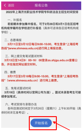 (一)请考生认真对照我校《2022年上海济光职业技术学院专科依法自主招生章程》所规定的“免笔试、面试”申请条件准备相应材料,所有证书直接拍照上传即可,原件自行留存备查。若有各类证书成绩已出但尚未领到相关证书的,请提前到相关网站查询后提供包含查询网址的页面截图上传(或联系颁证机构出具考试合格证明)。(二)所有考生务必于3月11日-12日9:00-15:00登录上海招考热线(www.shmeea.edu.cn)填报志愿。(三) “免笔试、面试”申请通过审核的考生注意在上海招考热线填报院校及专业志愿时第一专业须与预报名系统中的“专业意向”相同,面试资格方为有效。(四)网上缴费时间:3月17-18日9:00-15:00登录上海招考热线(www.shmeea.edu.cn)办理缴费,若未缴费则取消面试或笔试资格。四、 系统具体操作流程
