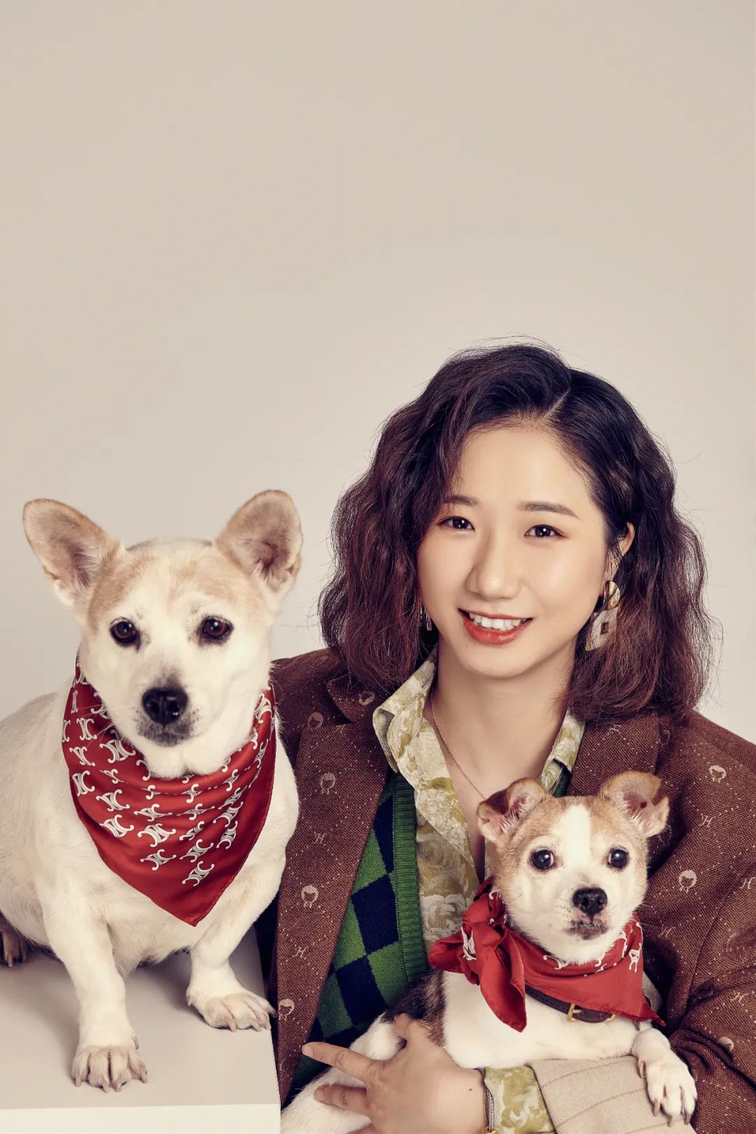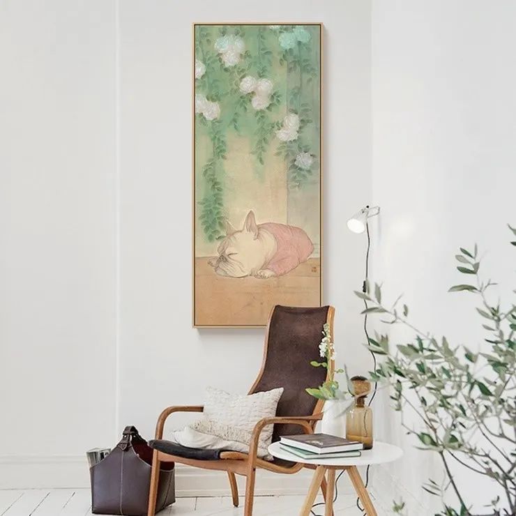 左脚旁依偎着那身附花斑的小狗,眯着眼