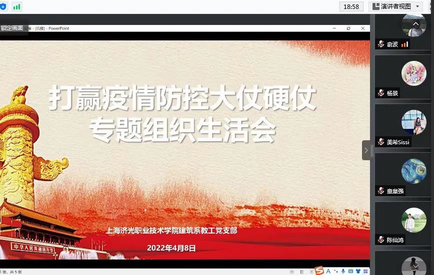 4月8日下午,建筑系教师党支部以线上方式召开打赢疫情防控大仗硬仗专题组织生活会,传达党中央、教育部、上海市及学校疫情防控有关精神和要求,通报上海疫情防控形势和学校疫情防控情况,对学校下一步疫情防控工作再部署、再落实。纪检委员钱庆主持了会议。