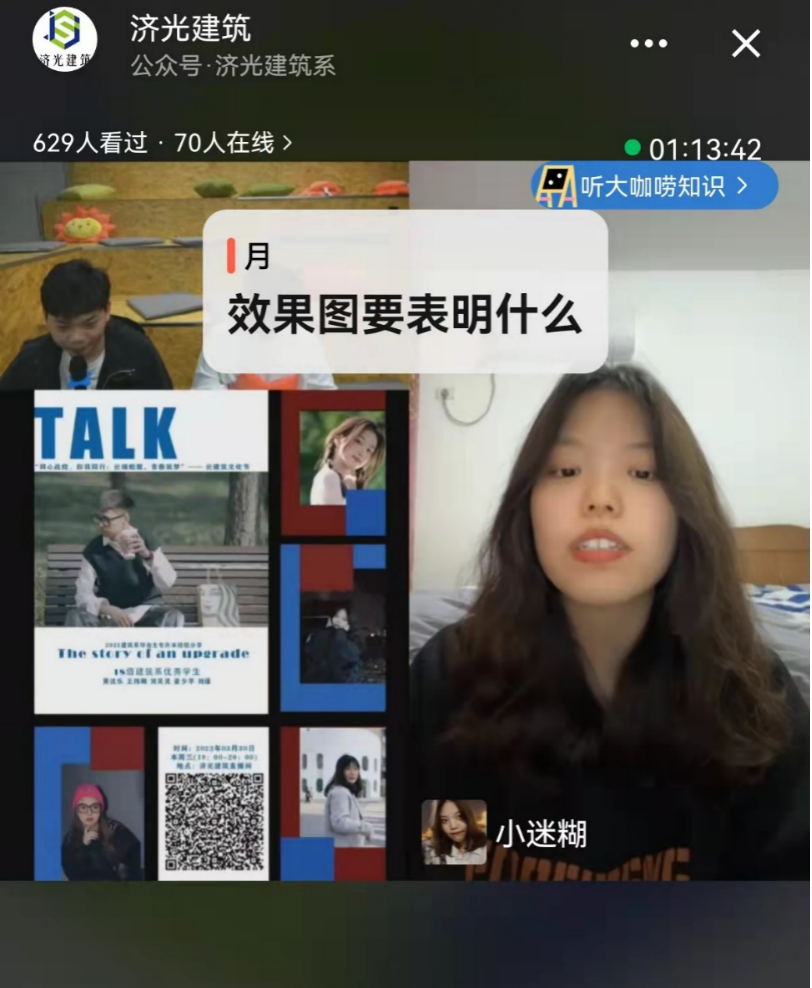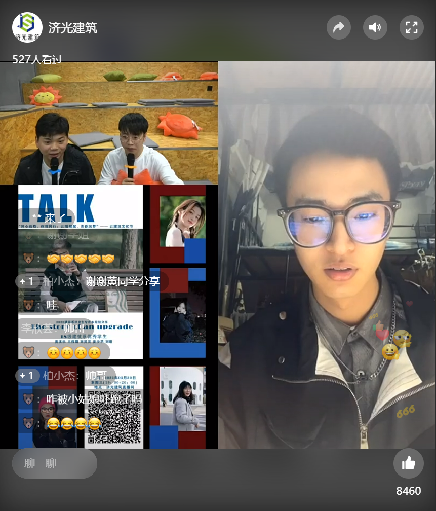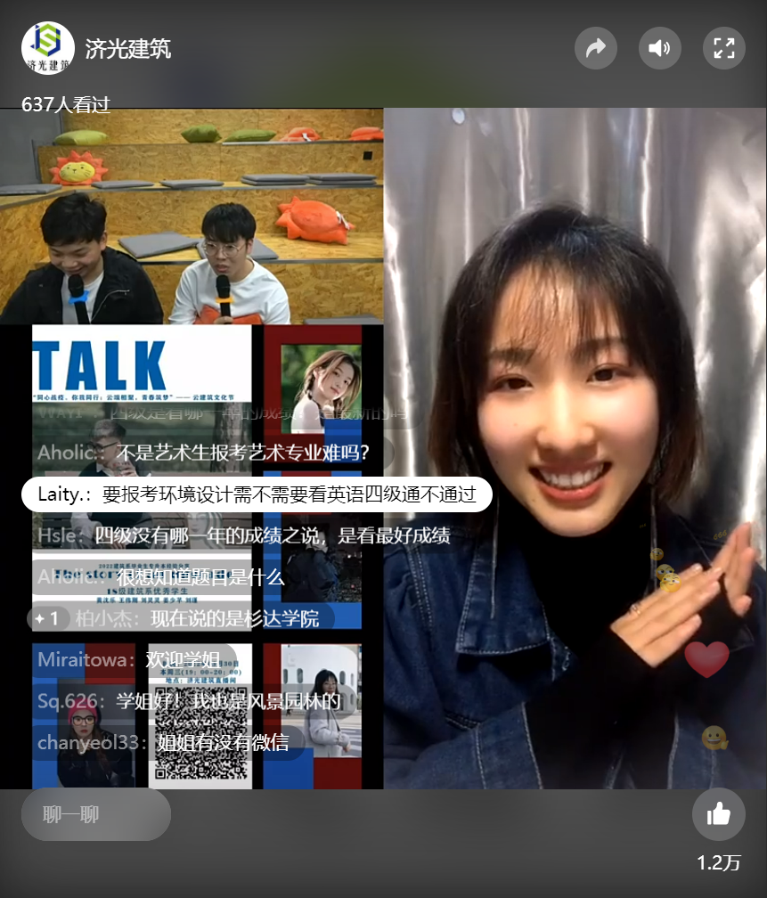 为进一步激发我系同学们专升本的积极性,提高同学们对专升本的认识,建筑系于3月30日19:00在“济光建筑系”直播间开展专升本备考经验交流分享活动,向准备专升本的同学提供相关的经验分享。5位2018级优秀毕业生分别连线进行分享。今天还邀请到我们亲爱的系主任岳华老师也来到了直播间现场,和同学们一起交流互动!本次直播分享共有近700人次参与,获点赞1.3万多。