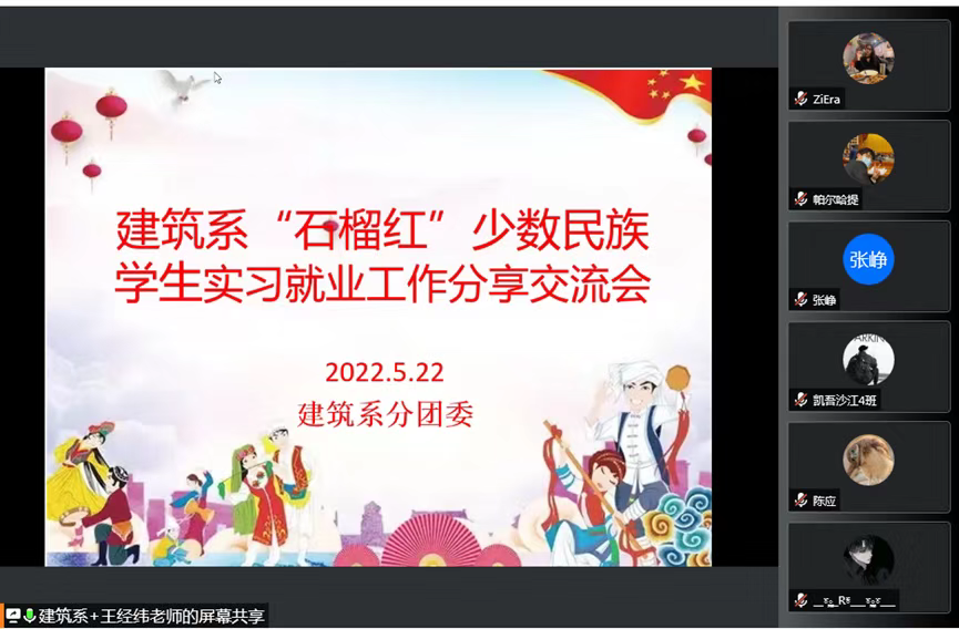 目前正值疫情期间与毕业实习季,为进一步落实学院党委对于少数民族学生的关心关爱,落实精准帮扶,积极发挥朋辈引领作用,同时推动少数民族学生实习、就业工作,提升少数民族学生的实习、就业率,促进各民族同学的共同进步。5月22日傍晚,在建筑系分团委书记王经纬老师的主持下,我系“石榴红”少数民族学生实习就业工作分享交流会就此展开,学生处周丹老师,建筑系党政领导、专业主任、辅导员、在校的少数民族学生、学生会干部和优秀实习毕业生代表等在线参加了会议。