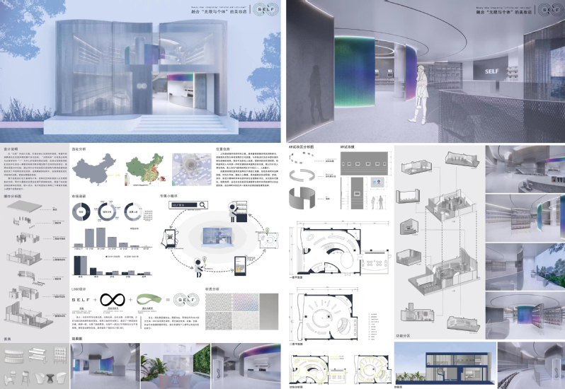 本届竞赛主题是“零售空间设计”,聚焦于当前互联网时代实体店发展模式的探索,考查学生对建筑外观、室内空间和附属庭院的综合设计能力。魏新静和朱海博同学的设计作品“SELF” 美妆集合店定位于上海,以“无限”为设计理念,打造全身心沉浸的体验式购物空间,激发消费者在此发掘并释放属于自己的美。作品完成阶段遇到上海疫情封控,两位同学和两位专业指导教师克服了重重困难,利用大量课余时间,线上反复研讨,确定主题和设计定位,深化完善设计方案,最终收获了这项难能可贵的奖项,体现了学院的教学水平。