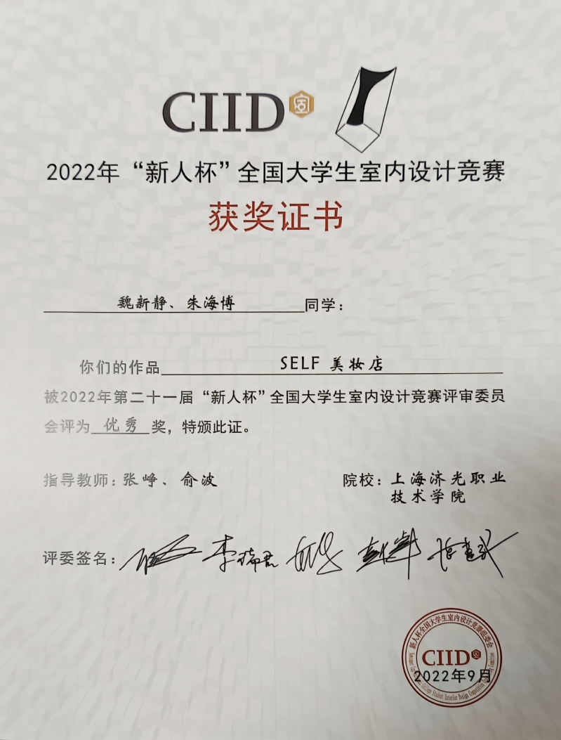 日前,由中国建筑学会室内设计分会(CIID)主办的2022年第21届“新人杯”全国大学生室内设计竞赛评审结果揭晓,我校建筑室内设计专业2020级学生魏新静、朱海博的设计作品“SELF”美妆集合店获得了优秀奖(指导教师:张峥、俞波)。