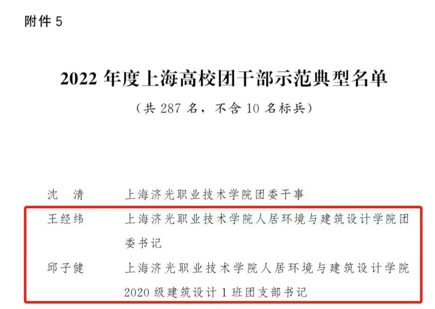 为表扬先进、树立典型,进一步增强示范引领,持续激发高校基层团组织、社团、团干部活力,共青团上海市委员会、上海市教育委员会经研究遴选,2023年1月发布《关于表扬2022年度上海高校、高中阶段学校活力团组织、活力社团、团干部示范典型的决定》,我院团委书记王经纬老师、2020级建筑设计1班团支部书记邱子健同学成功入选2022年度上海高校团干部示范典型名单!