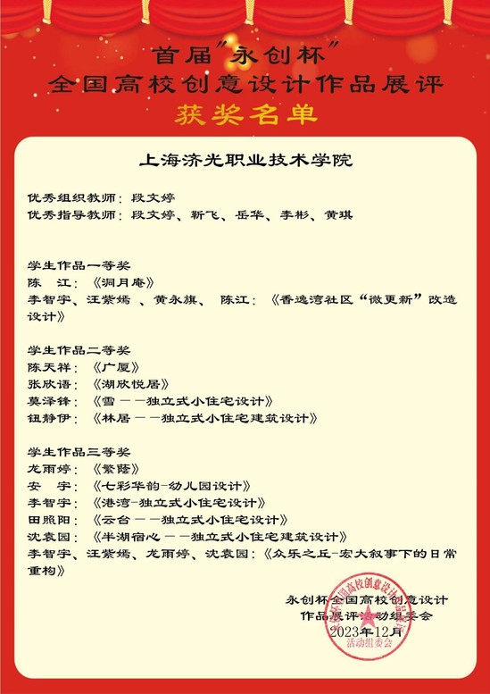 在永创杯全国高校创意设计作品展评中,我院建筑设计专业、风景园林设计、数字媒体技术专业总计提交30余件设计作品,最终18份作品脱颖而出,分获3个一等奖、6个二等奖、9个三等奖,指导教师分获优秀组织奖及优秀指导教师称号。