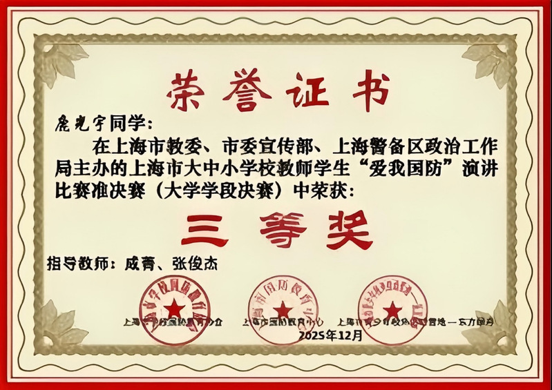 近日,2025年上海市大中小学教师学生“爱我国防”主题演讲比赛准决赛圆满落幕。我院2023级建筑设计专业鹿光宇同学凭借《以航天精神为炬,燃青春国防之志》的精彩演讲脱颖而出,荣获三等奖!